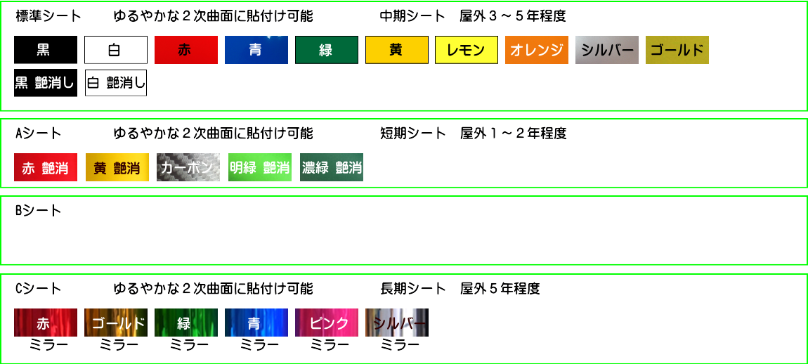 制作には、製品毎に様々なシートを使用しますが、主に中期用シート(屋外使用2~5年)を使用しています。用途により長期用シート(屋外使用5年)・超長期シート(屋外使用5~8年)もございます。
