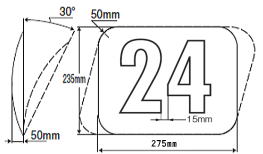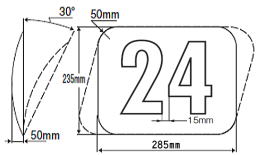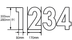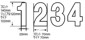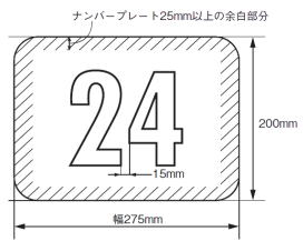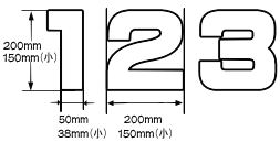 四輪![]() 数字はアラビア数字、書体はフーツラボールド。 数字の画線は50mm、数字のタテの長さは約300mmとする。 (リア部分番号のタテの長さは300mm未満でもよい。) 使用フォント:FUTURA-BOLD ![]() |