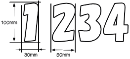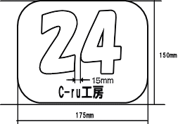 | Racing Cart 150mm×60mm JAF国内カート競技車両規則 字体は幅 20mmの字画で最小高 150mm (Superkartについては、30mmの字画で最小高 200mmとする) 使用フォント:ARゴジック体S |